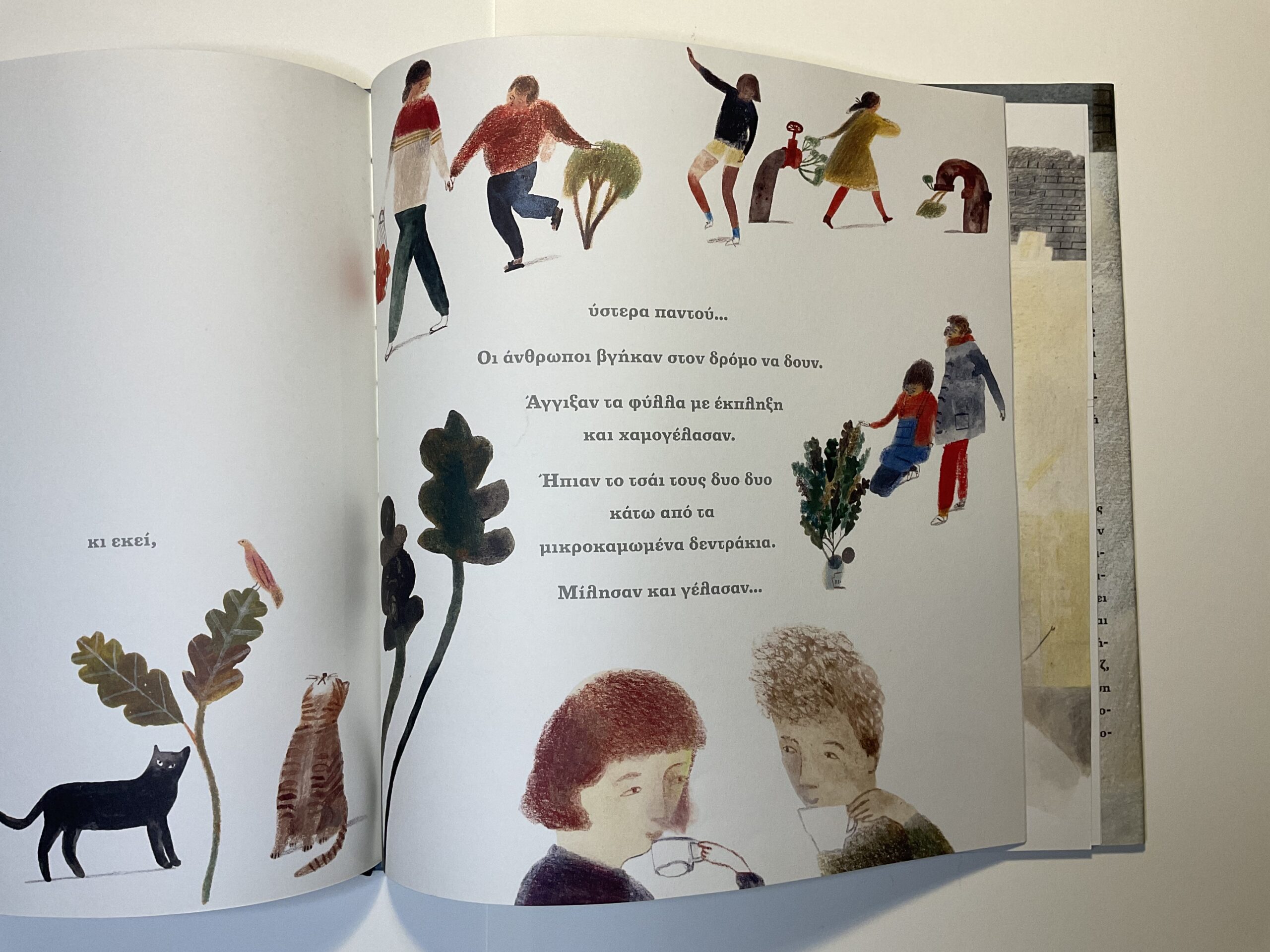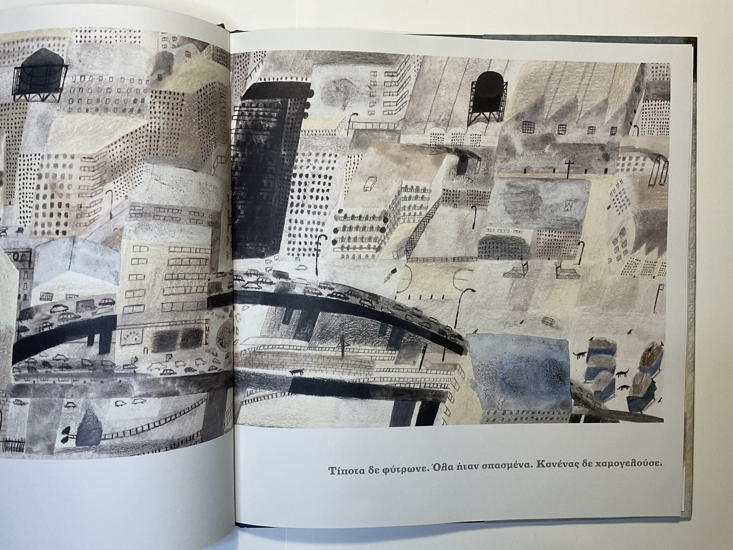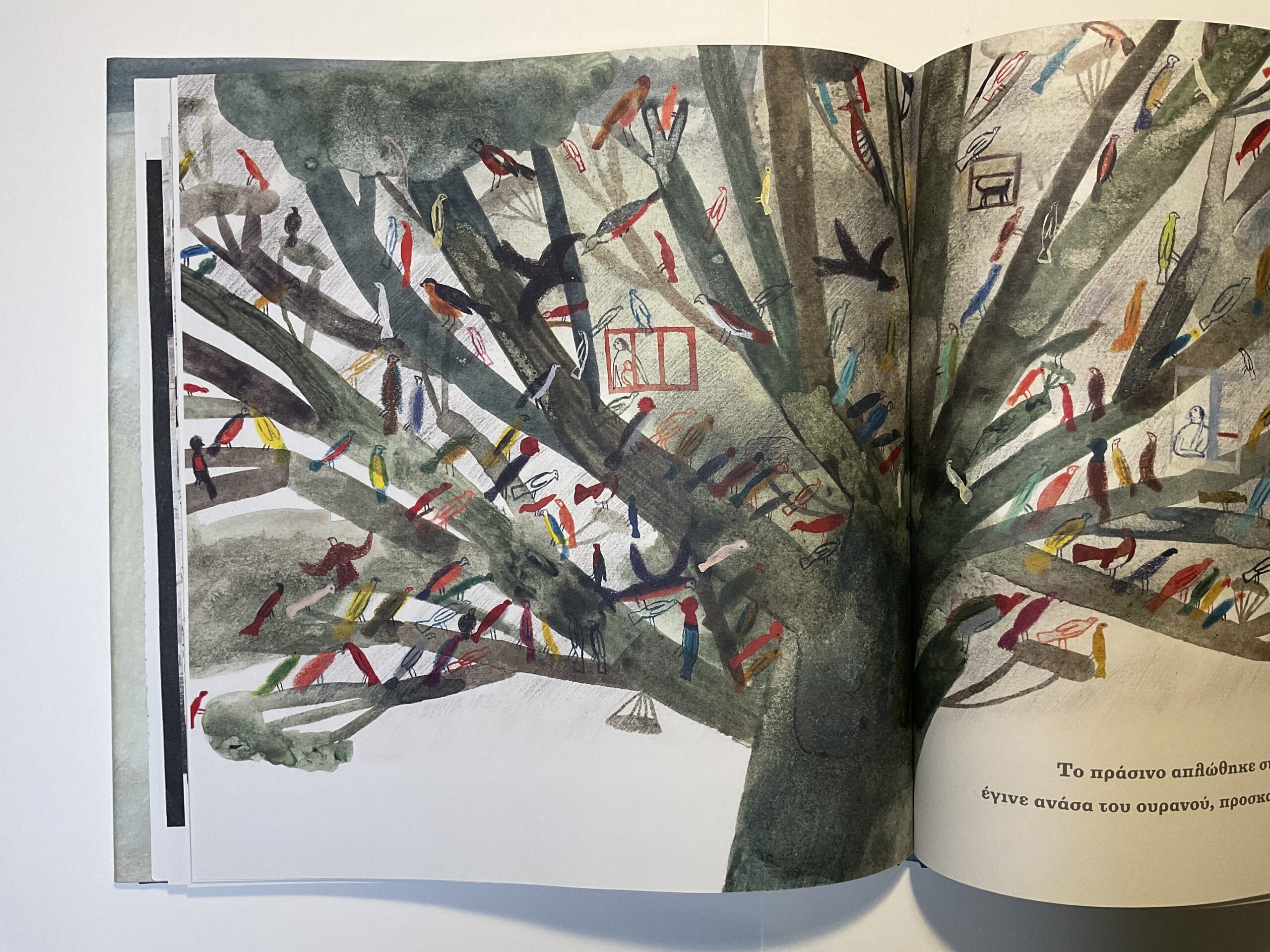 Το βιβλίο αυτό το είχα δει για πρώτη φορά στην ετήσια Έκθεση Παιδικού Βιβλίου της Μπολόνια, πριν μεταφραστεί στα ελληνικά, και μου είχε φανεί πολύ σκοτεινό. Για τον λόγο αυτό δεν περίμενα να το δω ποτέ στα ελληνικά. Ακόμη περισσότερο, δεν περίμενα να το συναντήσω στο ράφι ενός σούπερ μάρκετ της ελληνικής επαρχίας! Τότε, μάλλον ένιωσα ότι δεν θα το έπαιρνε κανείς και ότι θα κατέληγε σε κάποια αποθήκη, μαζί με ληγμένα μακαρόνια και ξεχασμένα μπαχαρικά — κι έτσι το αγόρασα. Ευτυχώς. Γιατί μετά την πρώτη, πιο προσεκτική ανάγνωση, άρχισα να βλέπω το φως του: την ιστορία που περιέχει μόνο ελπίδα, τις γκρίζες εικόνες που μετατρέπονται σε χρωματιστά εξωτικά πουλιά. Έγινε ένα από τα αγαπημένα μας βιβλία για καληνύχτα. Τελικά, τα βιβλία αξίζουν πολλές ευκαιρίες.