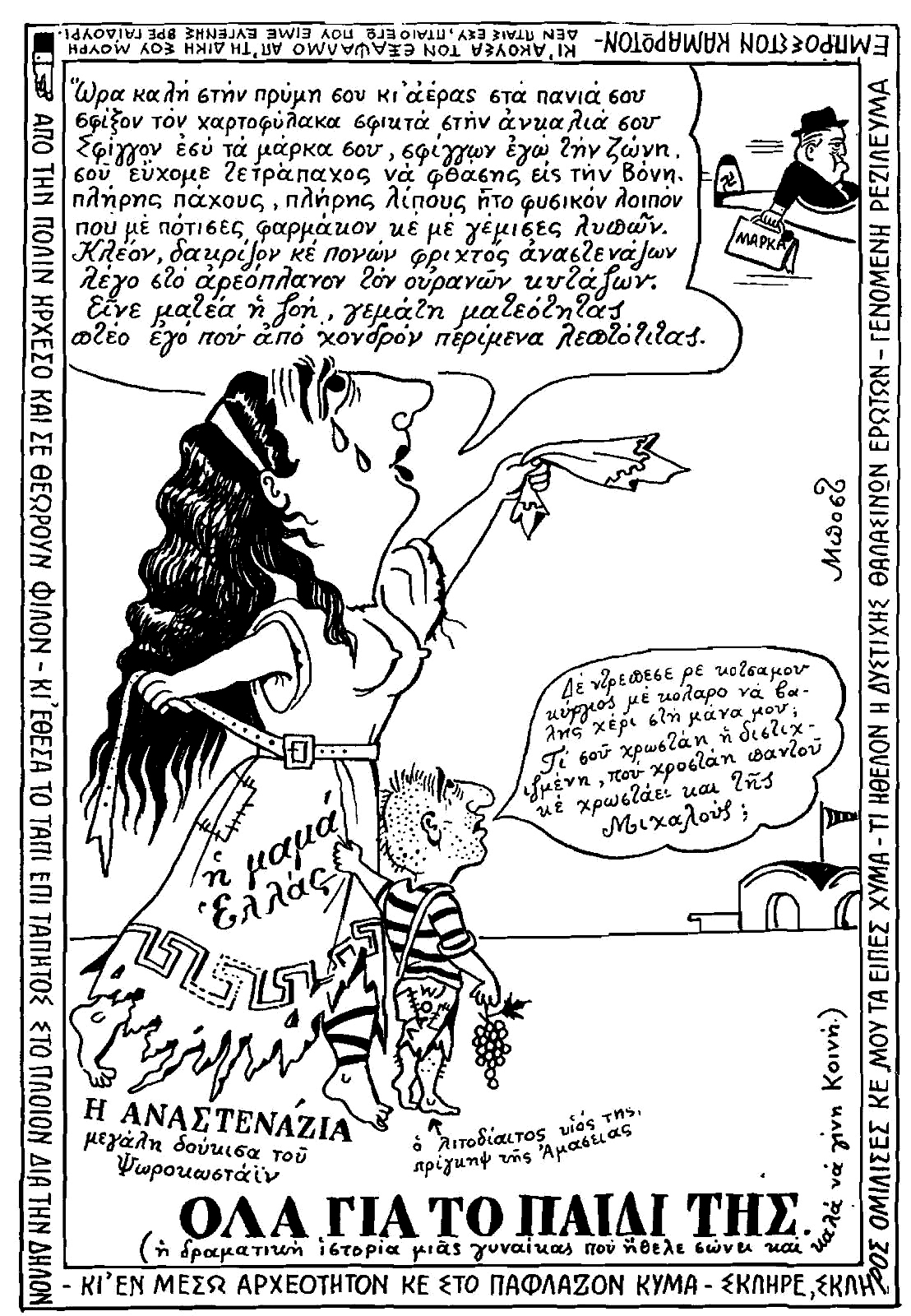 Ένα από τα βιβλία που ξεχώρισα από μικρή ηλικία στη βιβλιοθήκη της οικογένειάς μου ήταν το άλμπουμ, Σκίτσα του Μποστ. Οι γελοιογραφίες του με εντυπωσίαζαν: παρατηρούσα με θαυμασμό την καθαρότητα και την ακρίβεια με τις οποίες τα σκίτσα του αποτύπωναν τους χαρακτήρες· ενώ ο λόγος του με γοήτευε — οξυδερκής και θαρραλέα καυστικός. Παραμένει, για μένα, αξεπέραστος, χάρη στη βαθιά καλλιέργειά του, στην εξαιρετική αντίληψη της κοινωνικής και πολιτικής ζωής της εποχής του, στο απαράμιλλο σατιρικό του πνεύμα και τη διαυγή αναπαραστατική δύναμη των σκίτσων του.