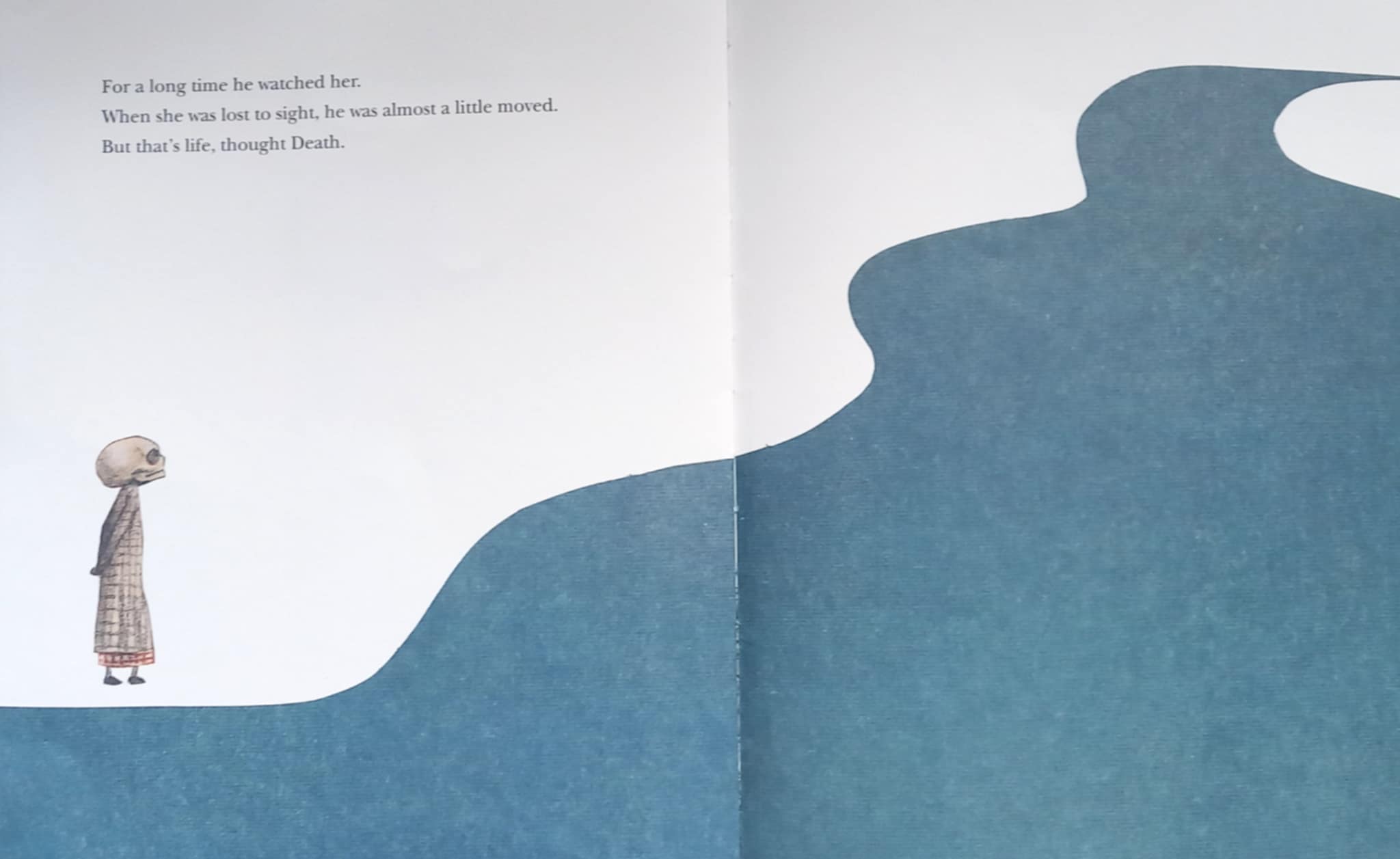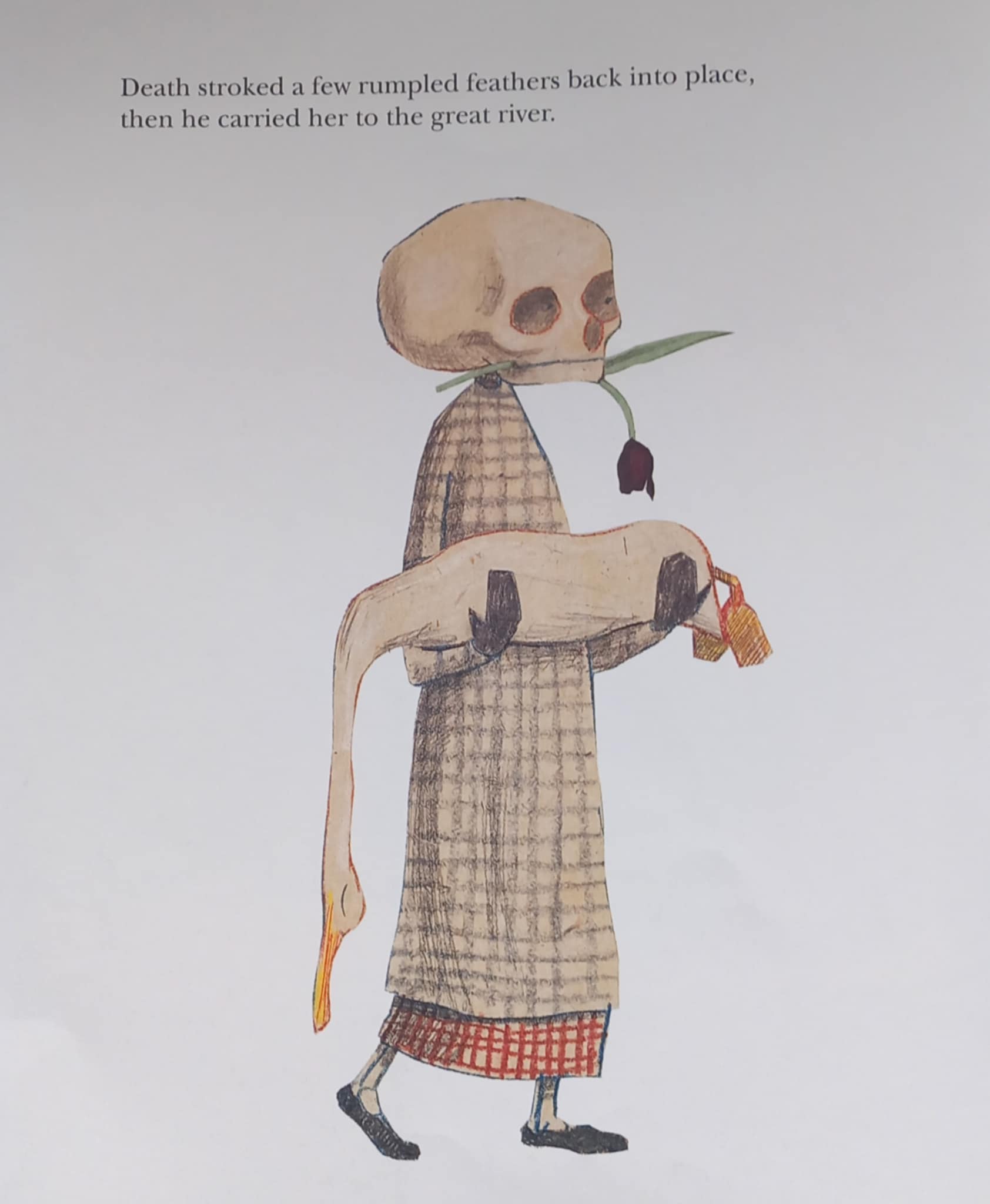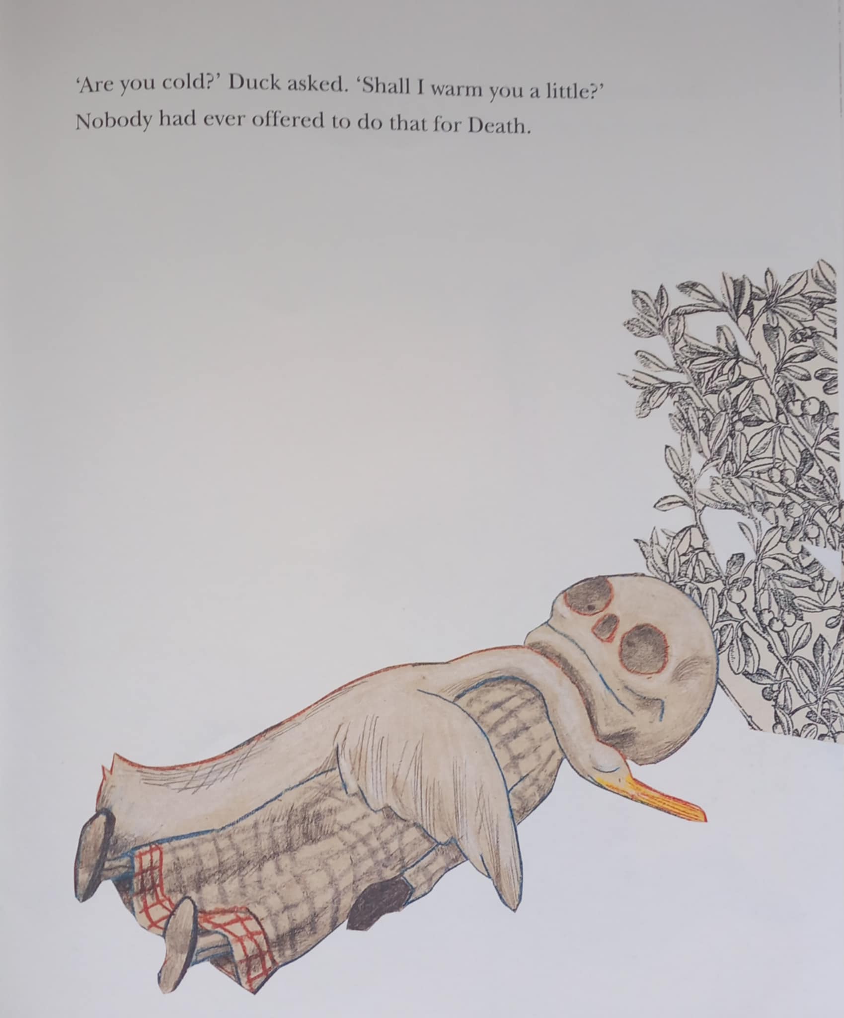 Ένα από τα αγαπημένα μου βιβλία που εμπεριέχει όλα τα στοιχεία που θέλω να δω σε ένα παιδικό βιβλίο. Πιάνει πολύ καθαρά ένα δύσκολο θέμα με χιούμορ και τρυφερότητα. Ο θάνατος συναντάει μια πάπια , αναπτύσσουν μια πολύ γλυκιά σχέση μέχρι το τέλος που η πάπια θα πεθάνει για να κλείσει το βιβλίο με τη φράση , but that`s life , thought death. Η εικονογράφηση βασίζεται στους 2 χαρακτήρες , οι οποίοι καταφέρνουν να είναι πολύ εκφραστικοί και συγκινητικοί κυρίως από την στάση και την πλαστικότητα του σώματος τους.