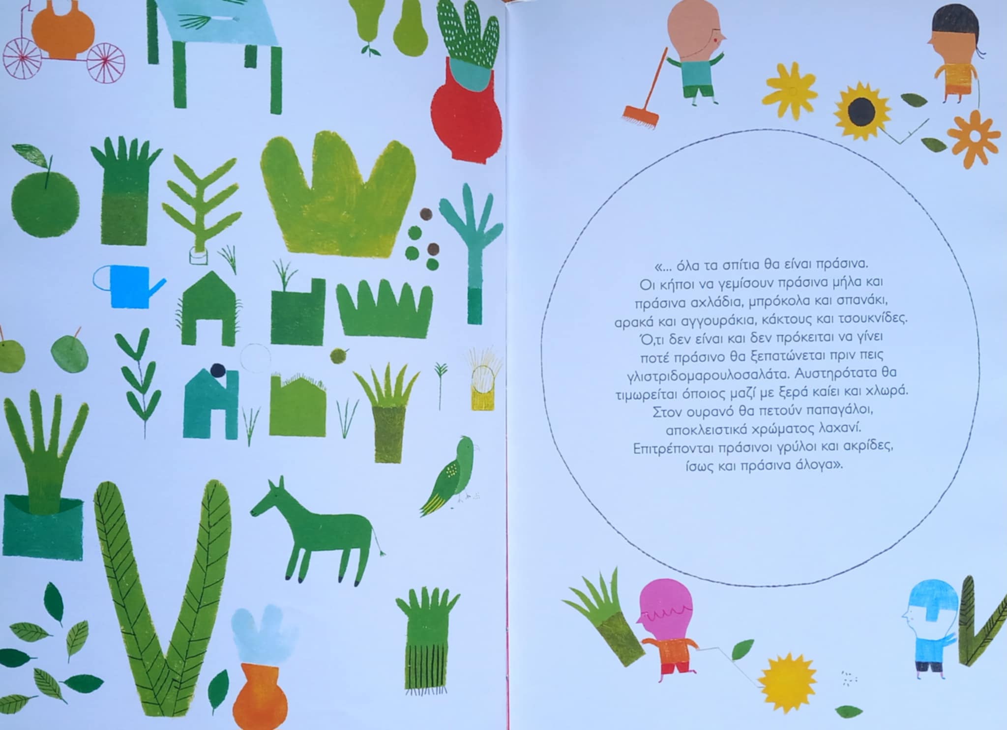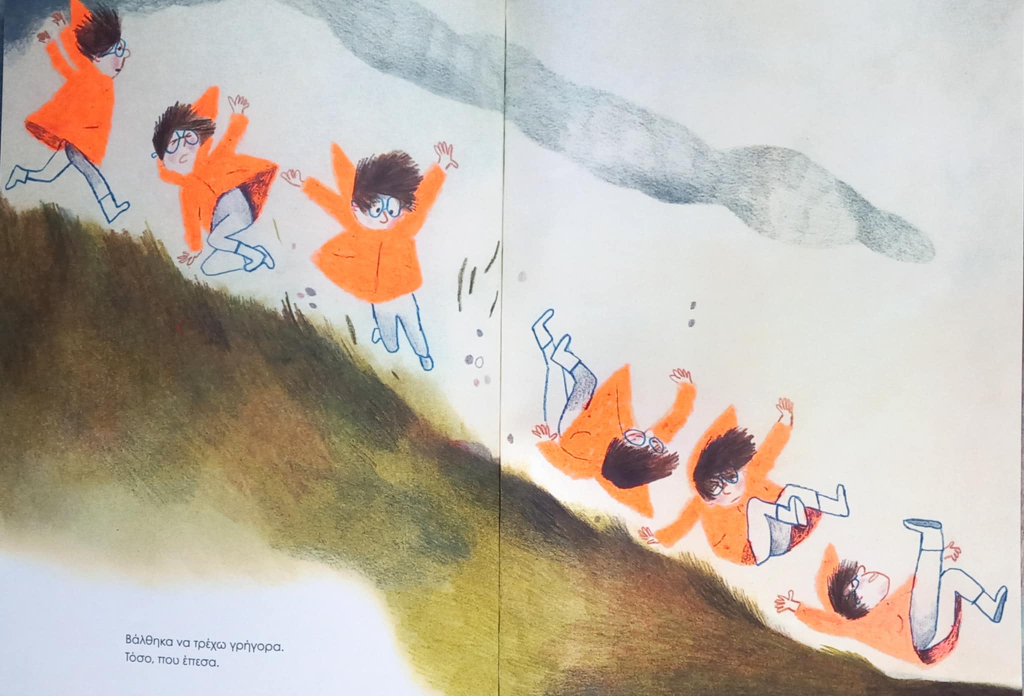 Η Ροδούλα Παππά γράφει μια ιστορία για το τι μπορεί να γίνει όταν ένα γυαλιστερό αντικείμενο έρθει και κάτσει πάνω σου. Μεγάλη αντάρα… και μαζί με τον Κώστα Μαρκόπουλο φτιάχνουν ένα απολαυστικό βιβλίο. Ο Μαρκόπουλος παίρνει πολύ καθαρές αποφάσεις στην εικονογράφηση , αποδίδει τέλεια το κείμενο χωρίς την αίσθηση της αφηγηματικότητας, εικαστικά, παιδικά και με καθαρά φωτεινά χρώματα . Ο άνεμος φυσάει τέλεια , το δυνατό κατακίτρινο φως είναι όντως δυνατό και κατακίτρινο!