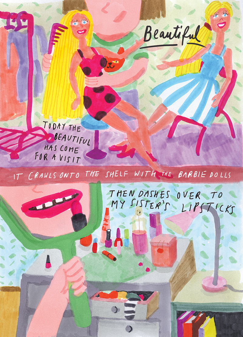 Σήμερα θα ήταν αδύνατο να αναφέρω λίγους μόνο. Θαυμάζω πάρα πολλούς: Beatrice Alemagna, Emma και Lisen Adbåge, Noemi Vola, Richard Scarry, Saul Steinberg… Δεν ξέρω αν με επηρεάζουν άμεσα, αλλά, συνειδητά ή ασυνείδητα, όλοι απορροφούμε ό,τι μας αγγίζει. Και τελικά δεν έχει σημασία αν πρόκειται για εικονογράφηση, μουσική ή stand-up comedy—λατρεύω οτιδήποτε με εμπνέει να δημιουργώ ελεύθερα.