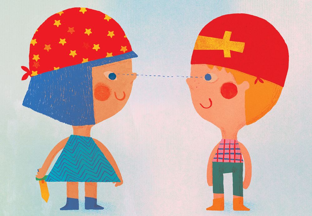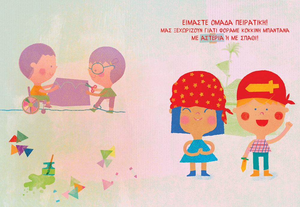 Το μυαλό μου πήγε σε θάλασσες και τρομερούς πειρατές, που αγαπούν τα παιδιά. Τα φαντάστηκα να παίζουν σε πισίνες με τα καραβάκια τους και ντύνονται πειρατές. Ανοίγω την πόρτα (εξώφυλλο) και κοιτάζω από την κλειδαρότρυπα (ταπετσαρία). Ένας δημιουργικός χαμός απλώνεται στο οπτικό μου πεδίο μέσα στο αγαπημένο μου «ροζ της Μυρτώς». Ψαλίδια, κόλλες, χαρτιά, γεωμετρικά όργανα και σχήματα, χρώματα, κορδέλες και σημαιάκια σκορπισμένα παντού. Ομολογώ ότι μία σχολική τάξη ήταν το τελευταίο που θα περίμενα να δω.