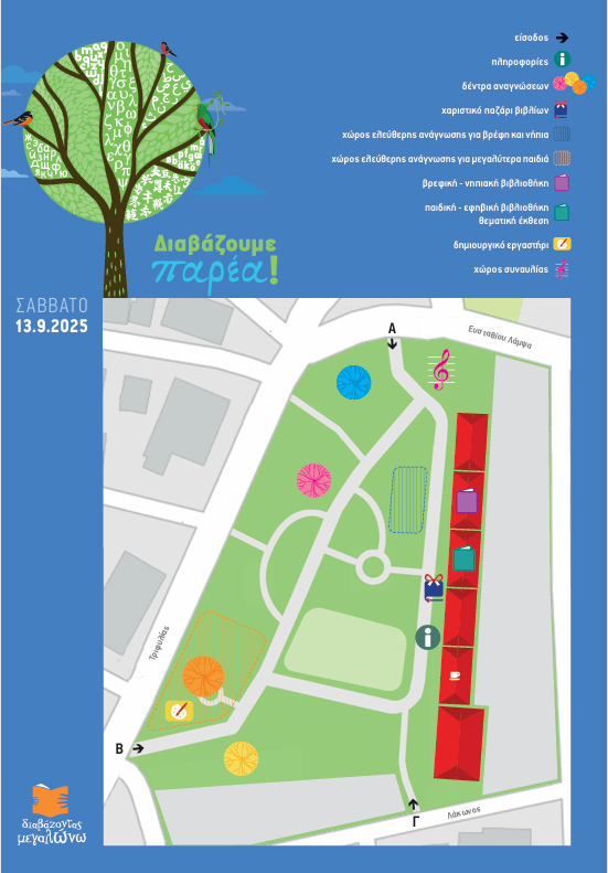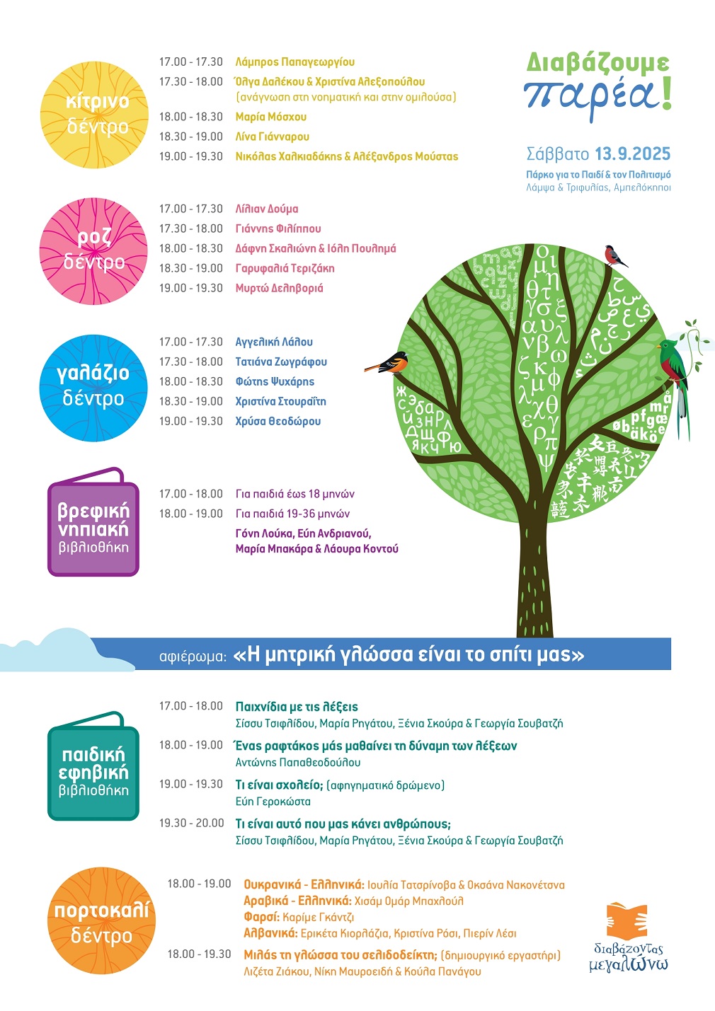 Οι αναγνώσεις θα ξεκινήσουν στις 17.00 και θα ολοκληρωθούν στις 19.30. Οι αναγνώσεις που απευθύνονται στα πολύ μικρά παιδιά θα πραγματοποιηθούν στη Βρεφική – Νηπιακή Βιβλιοθήκη, ενώ οι αναγνώσεις για τα μεγαλύτερα παιδιά θα γίνουν σε τέσσερα σημεία του Πάρκου κάτω από τα δέντρα. Στο ροζ, στο κίτρινο και στο γαλάζιο δέντρο οι αναγνώσεις θα γίνουν στα ελληνικά. Στους χώρους γύρω από το μεγάλο πορτοκαλί δέντρο, που στα κλαδιά του θα συνυπάρχουν γράμματα από διάφορες αλφαβήτους, οι ιστορίες θα διαβαστούν σε γλώσσες που μιλούν στο σπίτι τους πολλά από τα παιδιά που μεγαλώνουν στην Αθήνα: αλβανικά, αραβικά, ουκρανικά και φαρσί.