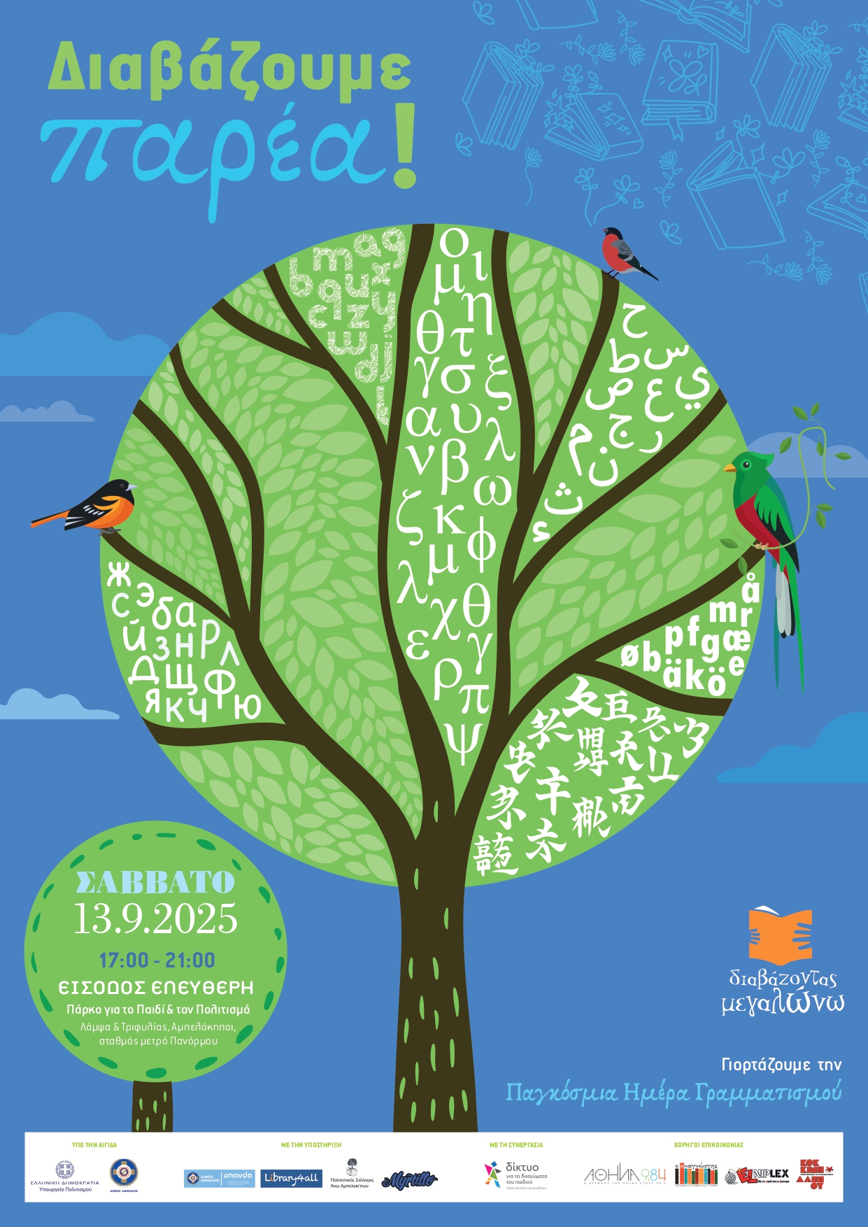 Με ιστορίες και βιβλία θα γιορτάσει και φέτος το Διαβάζοντας Μεγαλώνω την Παγκόσμια Ημέρα Γραμματισμού. Καλεσμένα στην γιορτή που θα γίνει στο Πάρκο για το Παιδί & τον Πολιτισμό το Σάββατο 13 Σεπτεμβρίου είναι όλα τα παιδιά: τα μεγάλα που πηγαίνουν στο σχολείο και τα πολύ μικρά που δεν ξέρουν να περπατούν, τα παιδιά που αγαπούν το διάβασμα, αλλά και εκείνα που δεν έχουν ακόμα συναντήσει τα βιβλία που θα τους κινήσουν το ενδιαφέρον.