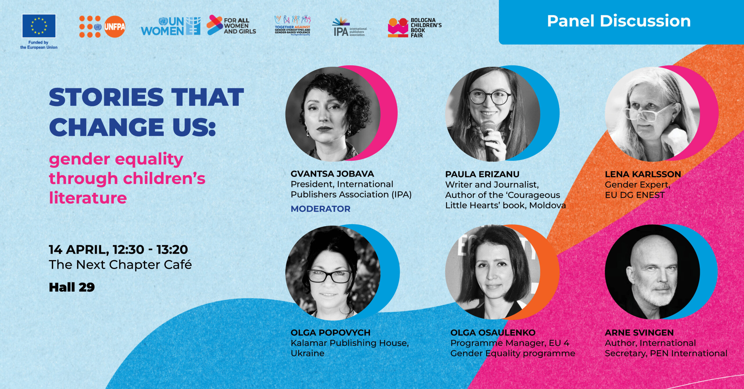 Στο πάνελ συμμετέχουν οι: Paula Erizanu, συγγραφέας και δημοσιογράφος, δημιουργός του Courageous Little Hearts στο πλαίσιο του EU 4 Gender Equality, Lena Karlsson, εμπειρογνώμονας σε θέματα φύλου, European Commission DG ENEST, Olga Osaulenko, υπεύθυνη προγράμματος EU 4 Gender Equality, UN Women ECA και ο Arne Svingen, συγγραφέας, διεθνής γραμματέας της PEN International. Πότε: 14 Απριλίου 2026, 12:30 – 13:20. Πού: The Next Chapter Café, Hall 29.