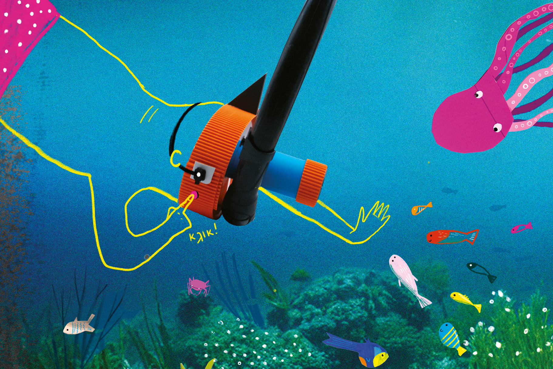 Η εικονογράφηση της Ίριδας Σαμαρτζή είναι από μόνη της ένα σχόλιο πάνω στην οπτική: κολάζ με πραγματικά εξαρτήματα φωτογραφικών μηχανών, χαρτιά και ζωγραφική, τρισδιάστατες κατασκευές που έχουν φωτογραφηθεί στέλνουν το μήνυμα ότι το χειροποίητο συνδιαλέγεται με το ψηφιακό και θυμίζουν διακριτικά πως η δημιουργικότητα ξεκινά από τα χέρια και την περιέργεια, από την φαντασία και τη συνεργασία.