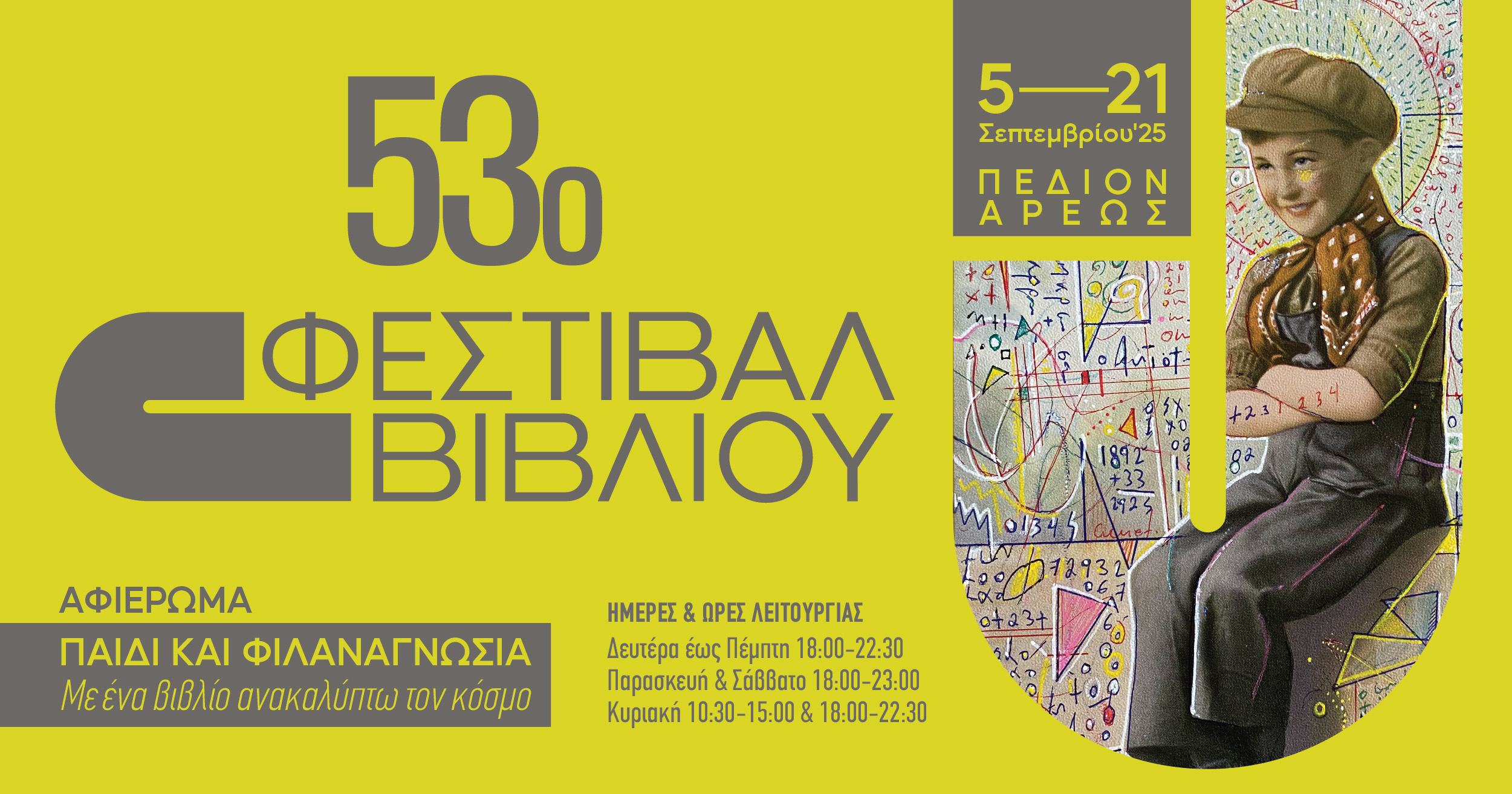 Το 53ο Φεστιβάλ Βιβλίου «ανοίγει τις πύλες του» στο Πεδίον του Άρεως στις 5 Σεπτεμβρίου για να υποδεχτεί τους φίλους του βιβλίου και να προσελκύσει νέους αναγνώστες. Στο φετινό φεστιβάλ συμμετέχουν περισσότεροι από διακόσιοι εκδοτικοί οίκοι, ενώ έχουν σχεδιαστεί πάνωαπό 200 πολιτιστικές εκδηλώσεις, συναυλίες, θεατρικές παραστάσεις και διαδραστικά εκπαιδευτικά δρώμενα που συμπληρώνουν το ήδη πλούσιο πρόγραμμα της φετινής διοργάνωσης, που έχει ως κεντρικό άξονα το παιδί και το βιβλίο.