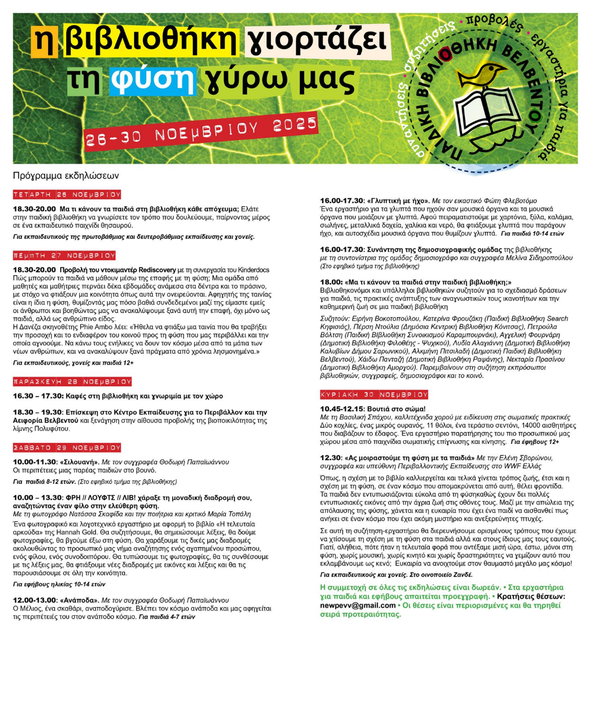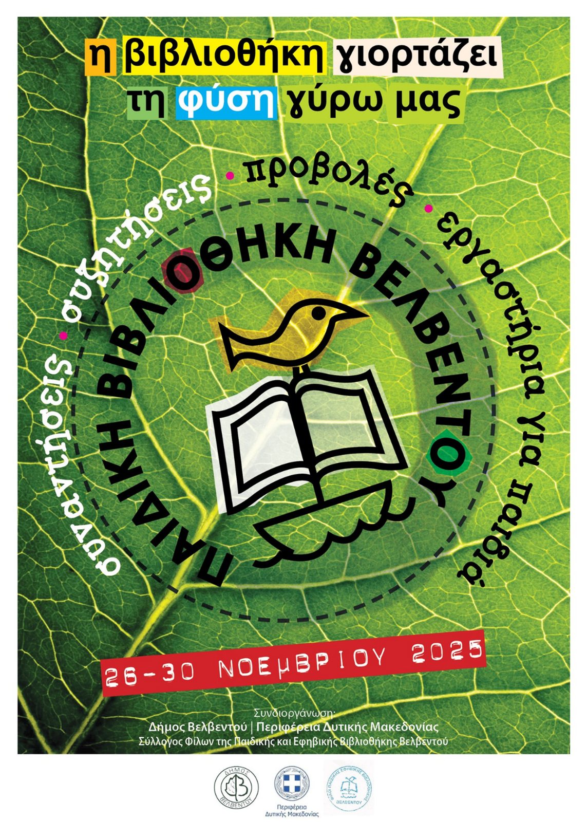 Ο Δήμος Βελβεντού συνδιοργανώνει με την Περιφέρεια Δυτικής Μακεδονίας και τον Σύλλογο των φίλων της Παιδικής και Εφηβικής Βιβλιοθήκης Βελβεντού «Annete Schlumberger» εκδηλώσεις στην Παιδική Βιβλιοθήκη από τις 26 έως τις 30 Νοεμβρίου 2025.