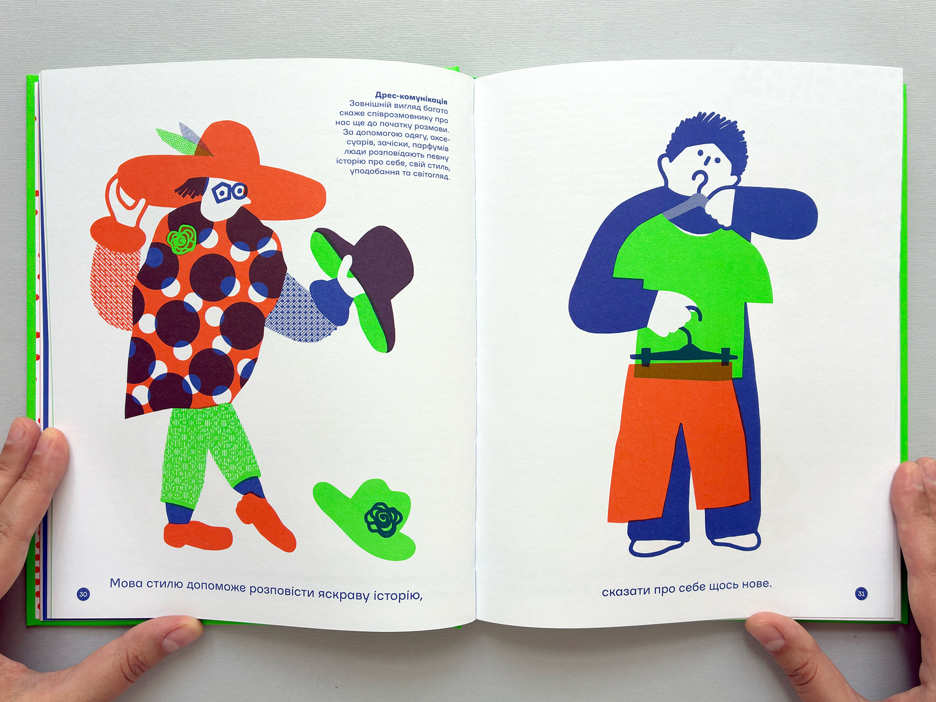 Αφετηρία για το οπτικό μέρος ήταν η αισθητική των σχεδιασμένων οδηγιών, όπου όλα είναι ξεκάθαρα, τα γραφικά έντονα και τα χρώματα έχουν σαφείς λειτουργίες. Σε αυτό το βιβλίο επιλέξαμε τρία χρώματα, με το πράσινο και το κόκκινο-πορτοκαλί να έχουν επιπλέον σημασιολογικό ρόλο: το πράσινο δηλώνει θετικές, επιβεβαιωτικές και χαρούμενες στιγμές επικοινωνίας, ενώ το κόκκινο-πορτοκαλί αρνητικές, απαγορευτικές ή δύσκολες. Μας αρέσει να δουλεύουμε με spot χρώματα PANTONE. Από τη μία, αυτό μας επιτρέπει να περιορίζουμε την παλέτα. Από την άλλη, μοιάζει με παραδοσιακές γραφικές τεχνικές, όπως η λινοτυπία, η ξυλογραφία, η μεταξοτυπία ή η ριζογραφία. Χρησιμοποιούμε εφέ οπτικής ανάμειξης και επικάλυψης χρωμάτων.