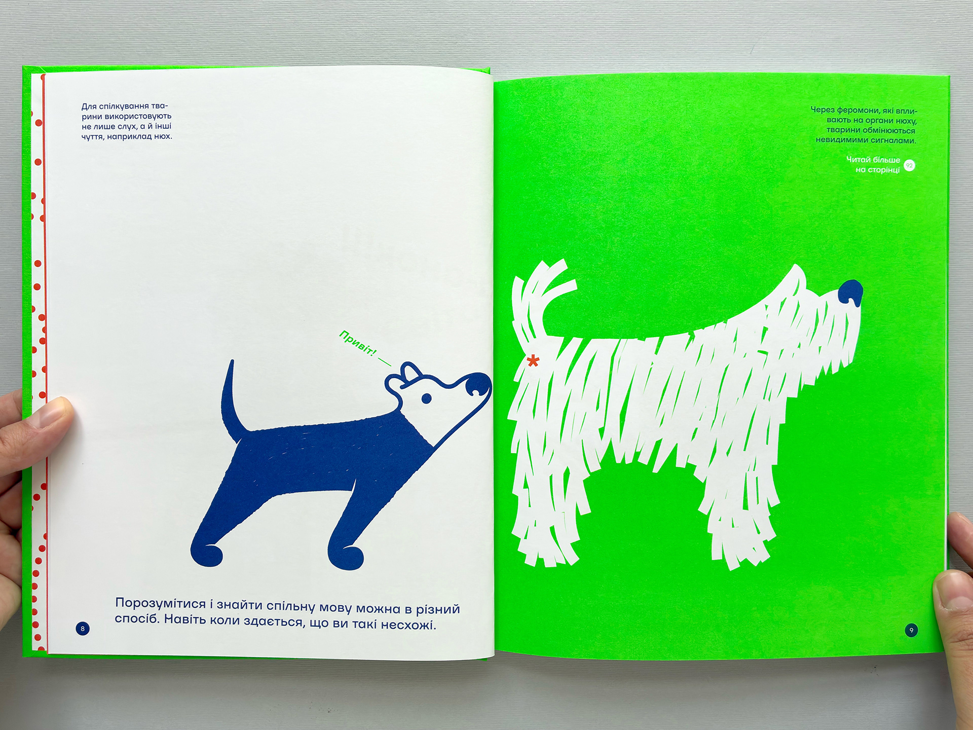 Μας αρέσει να επιλέγουμε απλά αλλά ταυτόχρονα πολύ παγκόσμια θέματα, τα οποία με την πρώτη ματιά φαίνονται προφανή, αλλά στην πραγματικότητα δεν έχουν εξερευνηθεί αρκετά στα βιβλία για παιδιά. Εμπνευστήκαμε από διάφορα πράγματα για να δημιουργήσουμε ένα βιβλίο για την επικοινωνία. Για παράδειγμα, από την καθημερινή ζωή στην Ουκρανία κατά τη διάρκεια του πολέμου, όπου η επικοινωνία γίνεται ζήτημα επιβίωσης. Συχνά προκύπτουν καταστάσεις όπου, χωρίς καμία τεχνική βοήθεια, χρειάζεται να καλέσεις σε βοήθεια και να περιμένεις κάποιος να καταλάβει το σήμα σου.