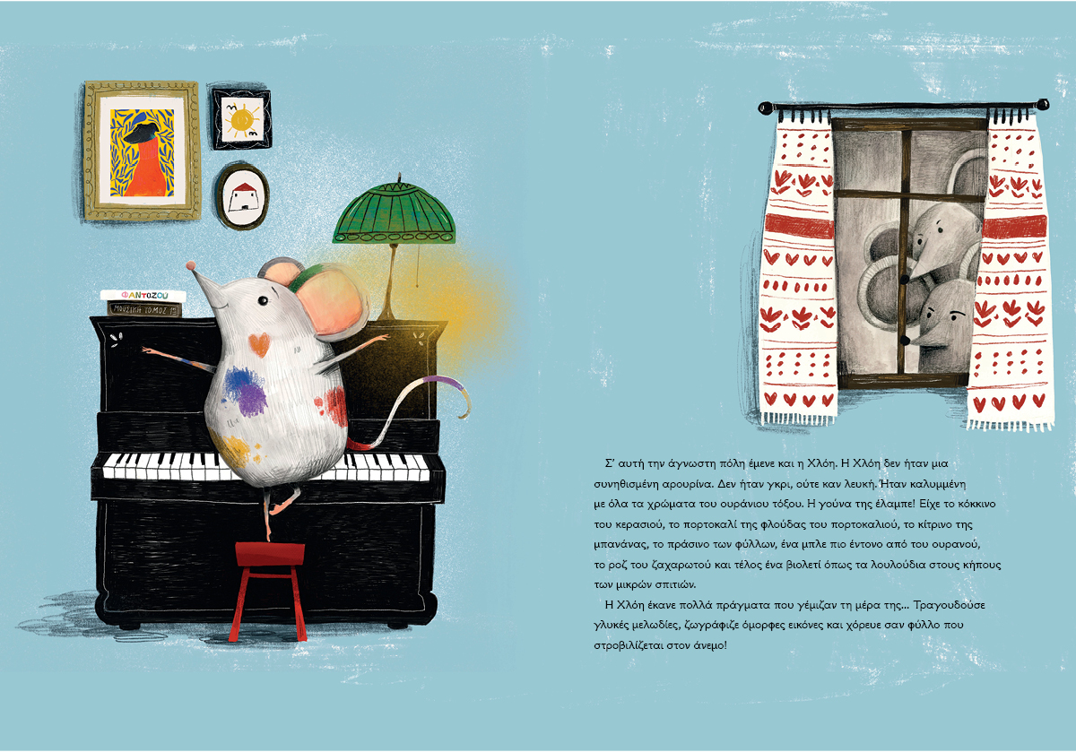 Η συνεργασία της Κατρίνας Τσάνταλη με την εικονογράφο Little Miss Grumpy συνεχίζεται και σε αυτό το βιβλίο με τη δεύτερη να ντύνει με τις εικόνες της την ιστορία της Χλόης. Εδώ, οι αντιθέσεις ανάμεσα στα μουντά γκρι των υπόλοιπων αρουραίων και στην εκρηκτική πολυχρωμία της Χλόης λειτουργούν σαν ένα εικαστικό σχόλιο πάνω στη διαφορετικότητα, αλλά και το πρότυπο-στερεότυπο της ομορφιάς.